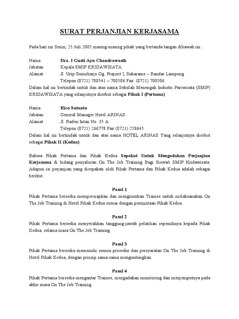 Contoh Surat Perjanjian Kerjasama Hotel Dengan Perusahaan
